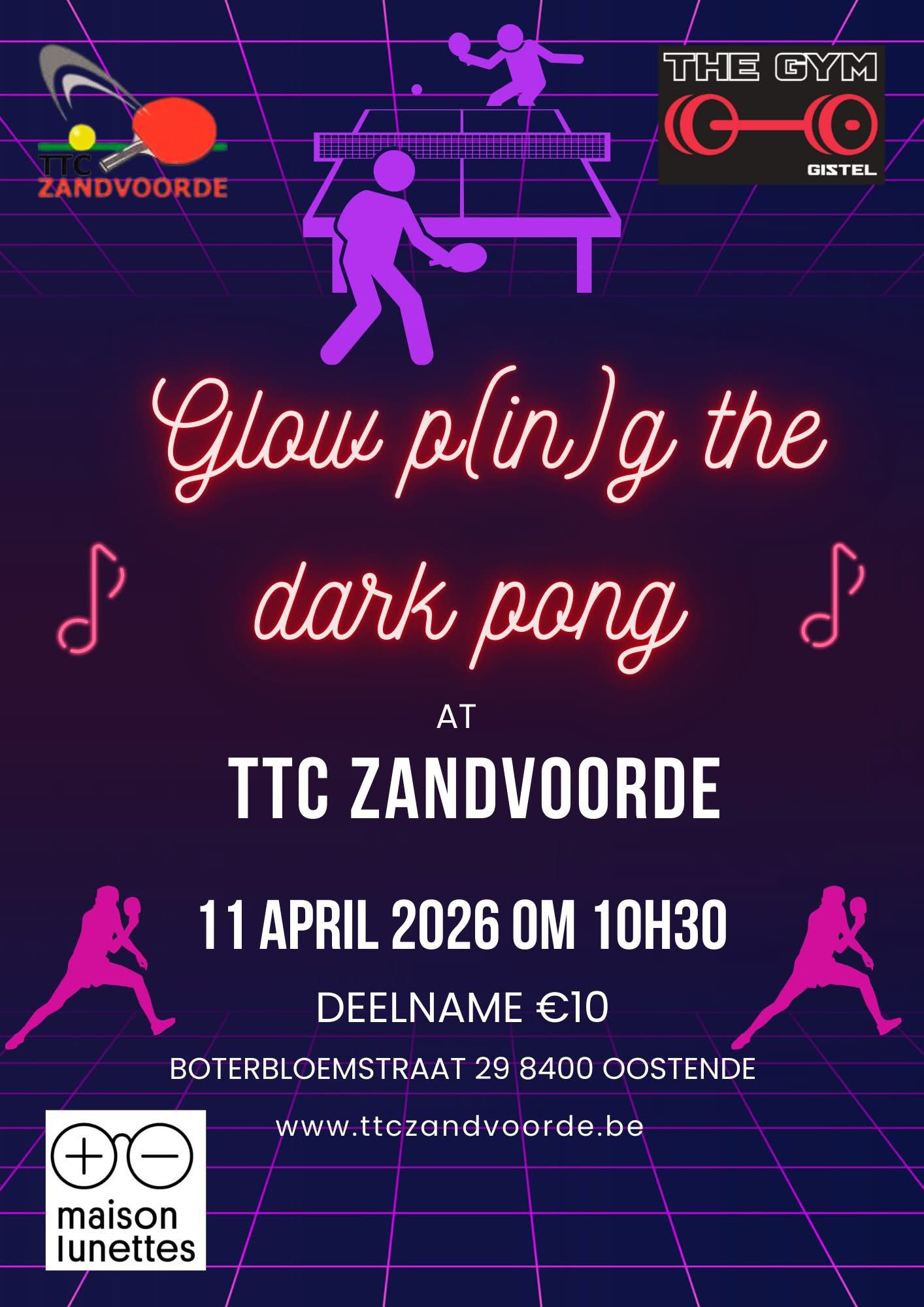 Op zaterdag 11 april 2026 organiseert TTC Zandvoorde de vierde editie van het glow in the dark-tornooi.