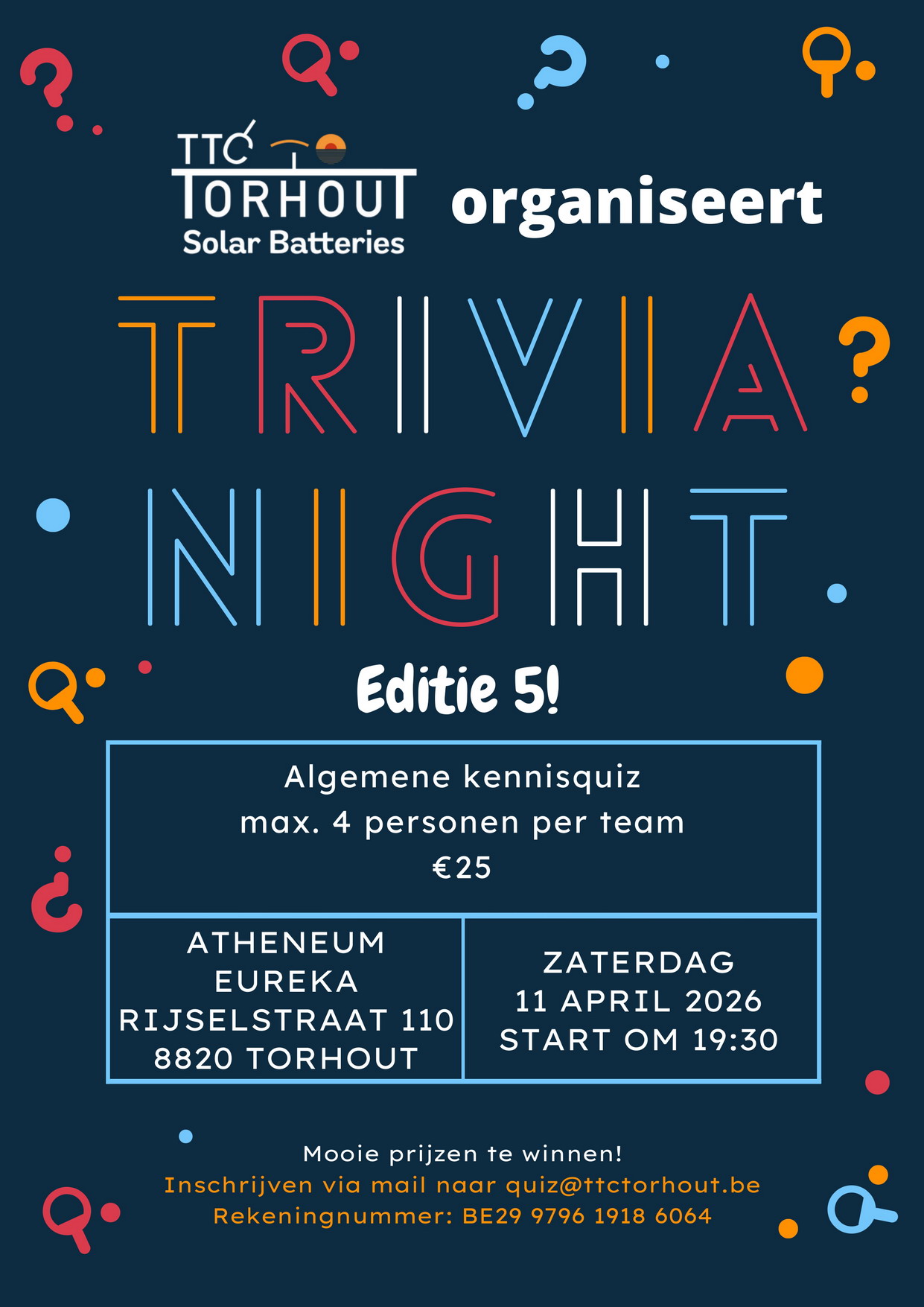 Op zaterdag 11 april 2026 organiseert TTC Solar Batteries Torhout haar vijfde 'Trivia Night', een algemene kennisquiz met een uitdagend, maar haalbaar niveau. Een groepje bestaat uit maximaal vier personen en iedereen ontvangt nadien een prijs. Vorig jaar namen er maar liefst 66 ploegen deel. Inschrijven kan via mail naar quiz@ttctorhout.be met vermelding van jouw teamnaam.